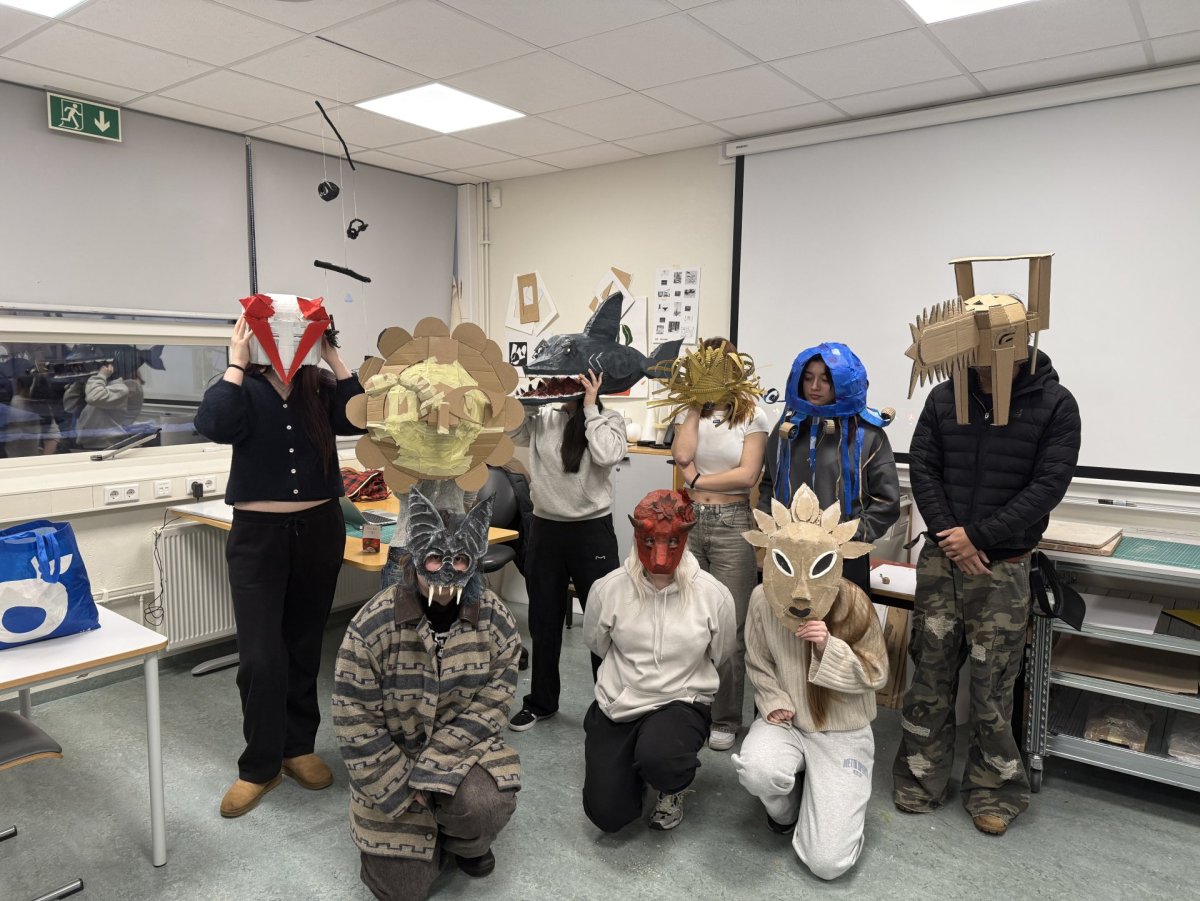 Nemendur nýttu meðal annars pappa, teip, málningu og ýmis endurunnin efni til að skapa grímur sem endurspegla bæði persónulegan stíl og skapandi hugsun.