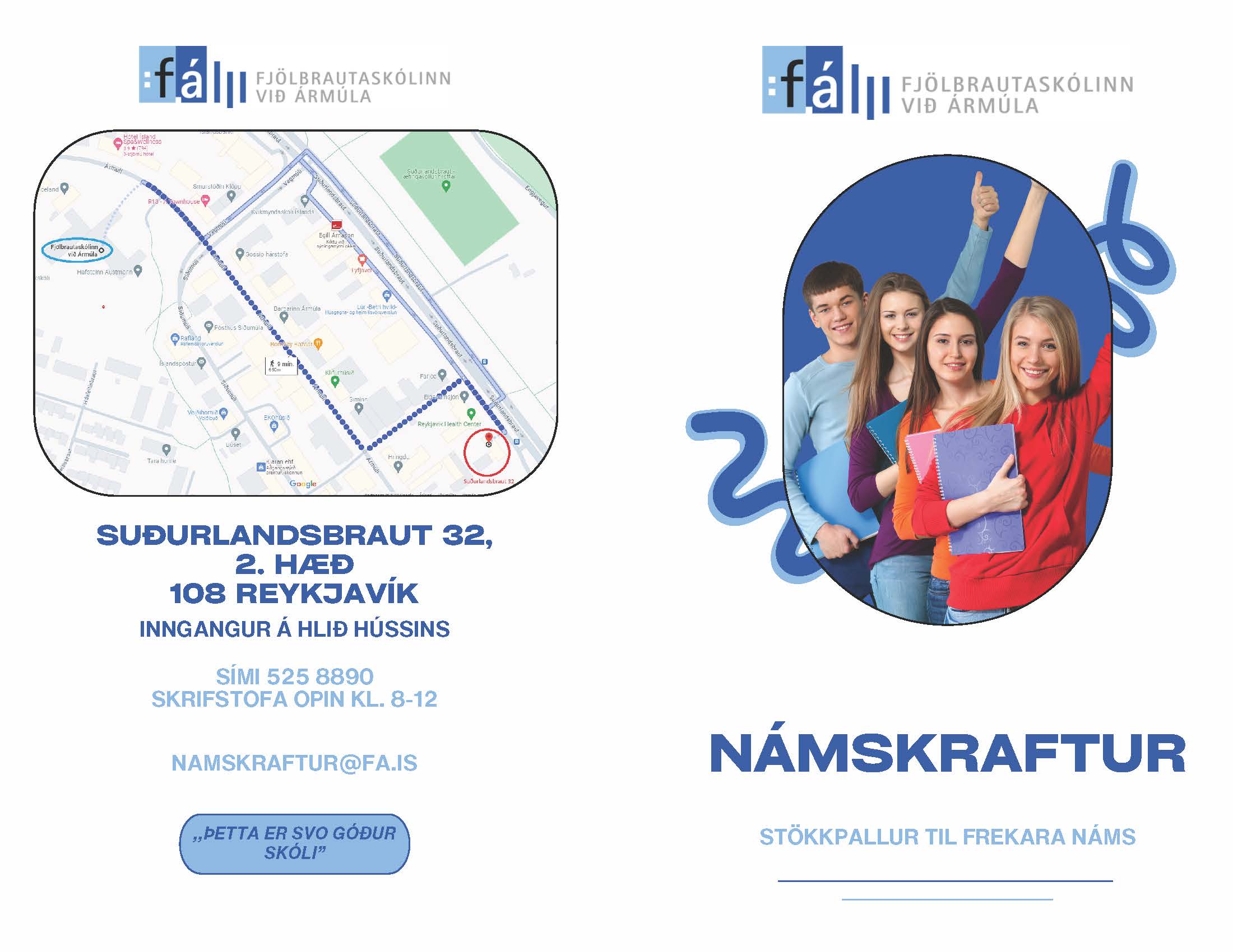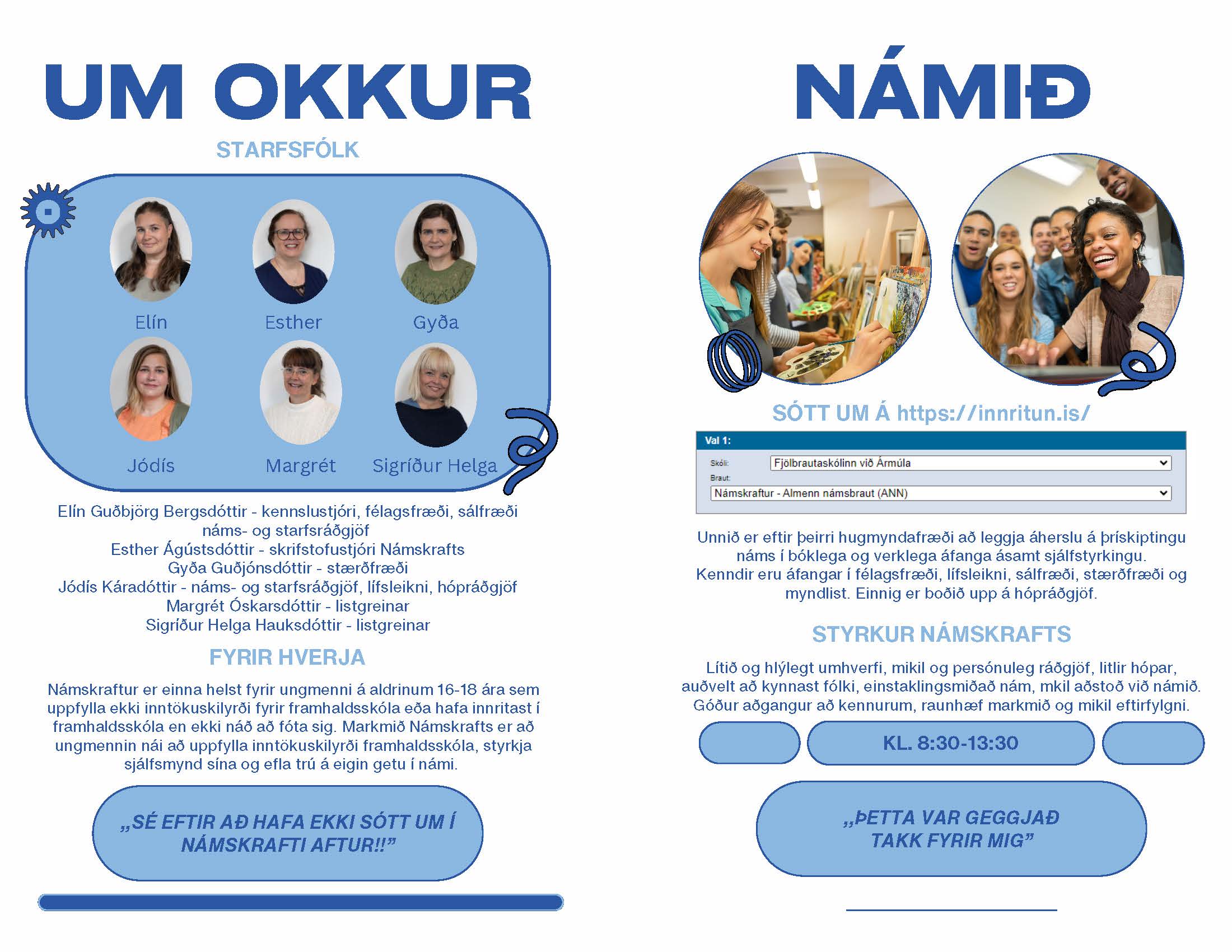 Nánari upplýsingar fást hjá Jódísi Káradóttur náms- og starfsráðgjafa Námskrafts og Elínu Guðbjörgu Bergsdóttur náms- og starfsráðgjafa og kennslustjóra Námskrafts í gegnum netfangið namskraftur@fa.is.